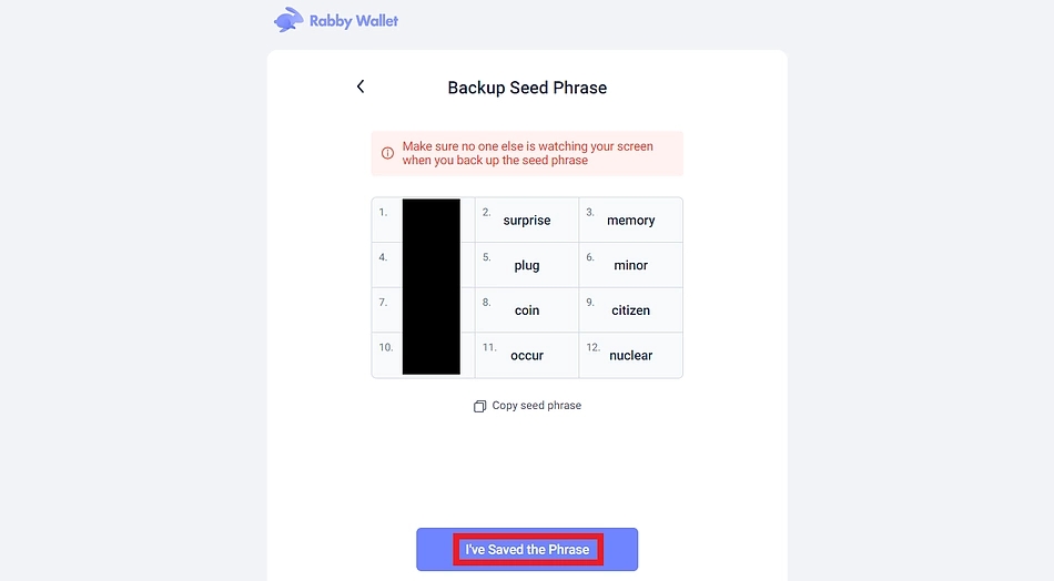 Your wallet seed phrase is displayed on the next page. Carefully copy and save the phrase (ideally offline and on crypto steel) and click Iโve Saved the Phrase to continue.