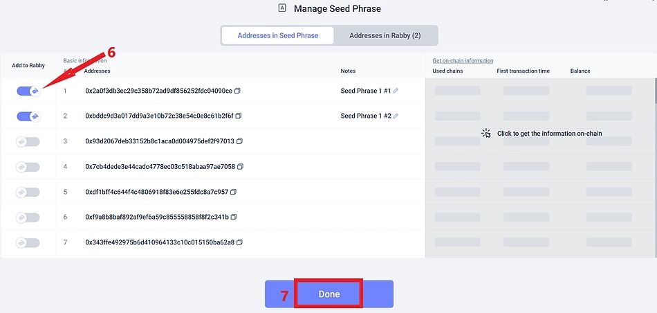 Click Done to proceed after selecting the addresses you wish to add to your wallet.