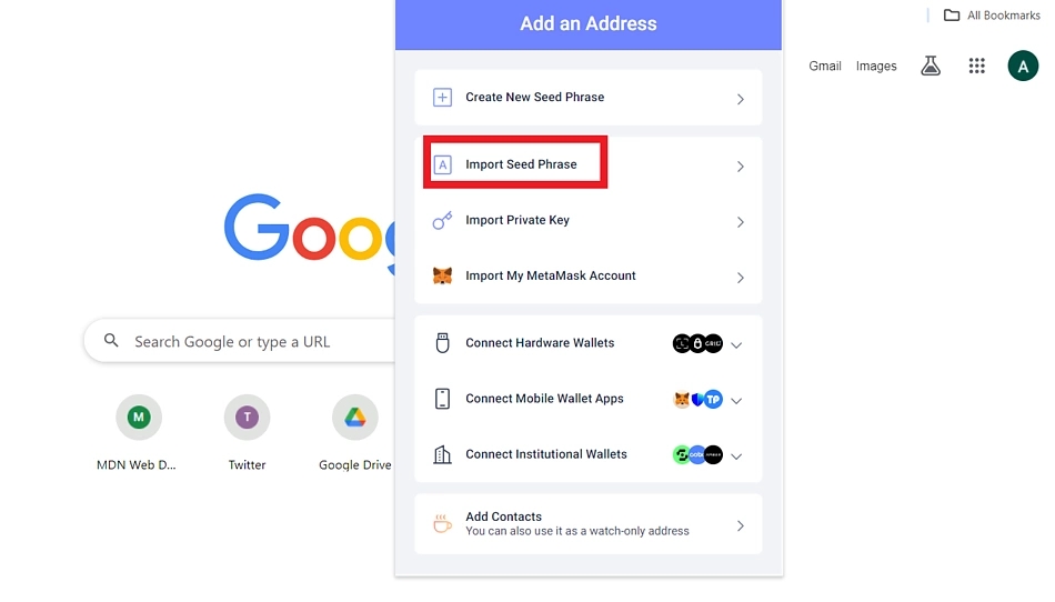 To import using your walletโs seed phrase click Import Seed Phrase.