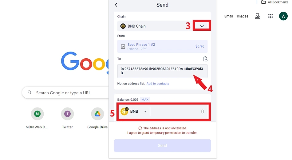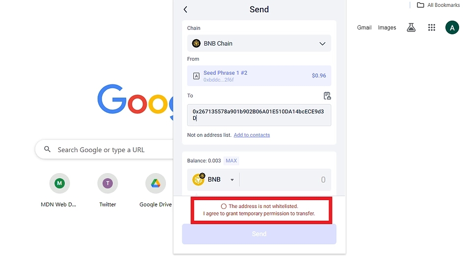 If the wallet is not whitelisted, check the box on the dialog at the bottom corner of your wallet to grant temporary permission for the transfer.