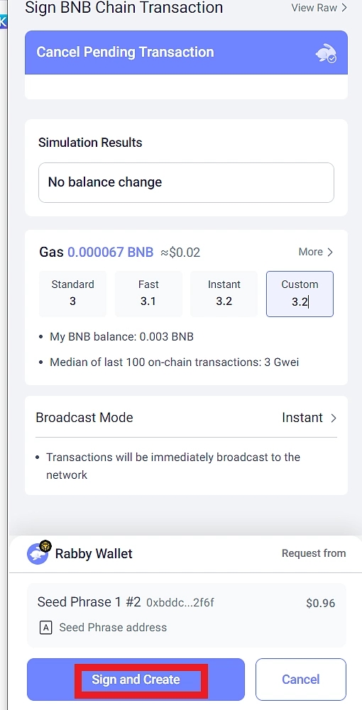 On the next page, set up other transaction parameters and click Sign and Create to complete.