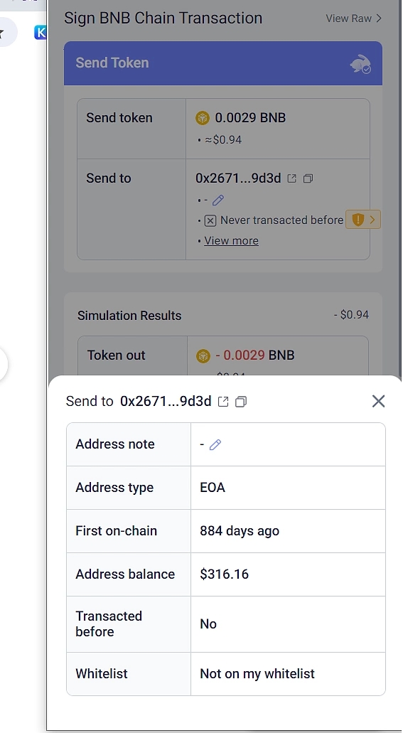 Rabby Wallet prompts users on various security issues before the final transaction confirmation. The security warning alert is displayed for issues such as the first transaction to a wallet, transfer to a suspected or non-whitelisted wallet, and more. To proceed with the transaction, these security warnings must be resolved.