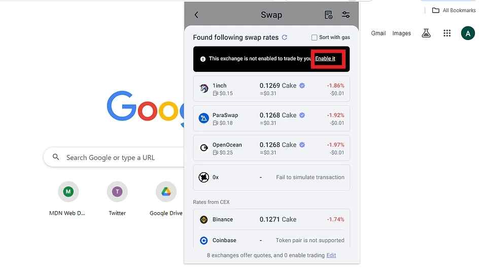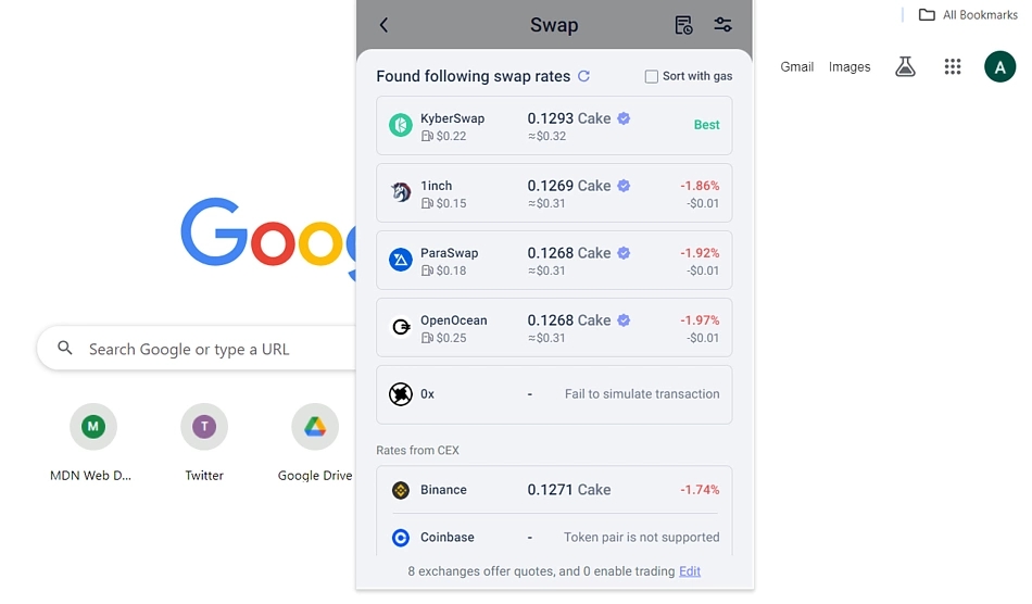 The in-wallet swap feature is available on most networks supported by Rabby Wallet. Supported decentralized exchanges include KyberSwap, 1inch, ParaSwap, and OpenOcean. Supported centralized exchanges include Binance, OKX, and Coinbase. Note that some assets are not supported (yet) on some centralized exchanges.